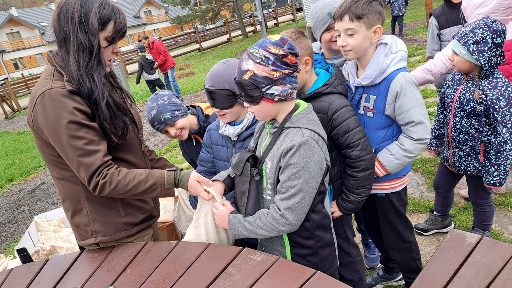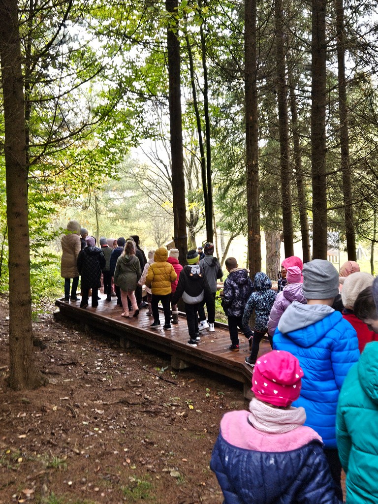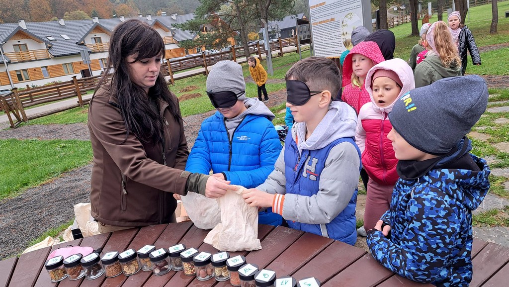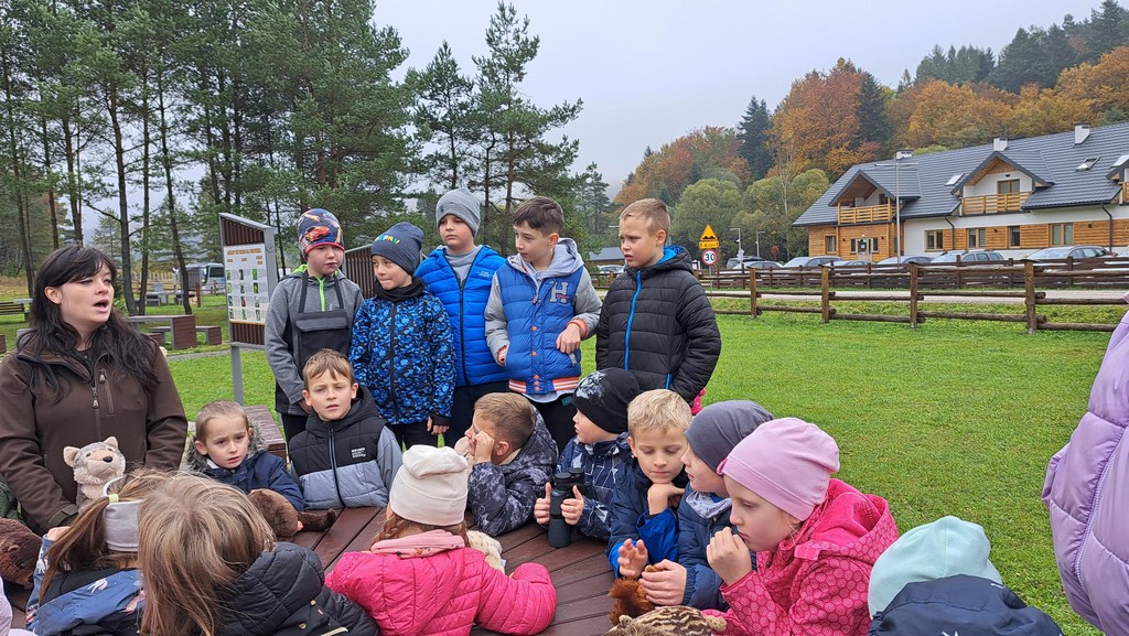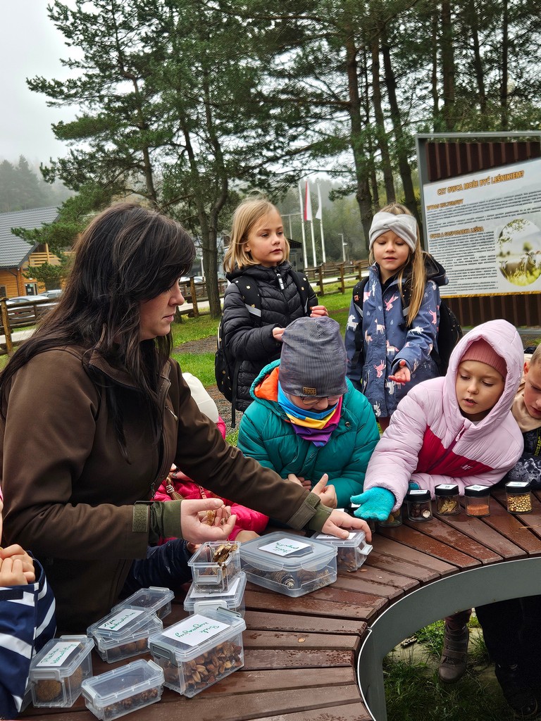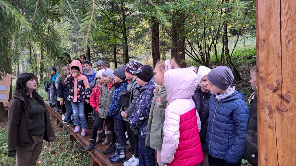 Na miejscu uczniów powitała Pani Izabela Maciąg z Nadleśnictwa Gorlice , która zaprosiła je na wspólny spacer po lesie. Podczas wędrówki dzieci poszukiwały jesiennych darów lasu i oglądały drzewa w pięknych kolorowych barwach. Dowiedziały się także jakich mieszkańców lasu można spotkać w rejonie Beskidu Niskiego i na co trzeba szczególnie zwracać uwagę podczas spacerów po lesie, m.in. jakich nie zbierać grzybów. Ponadto Pani leśnik pokazała dzieciom norę bobrów.