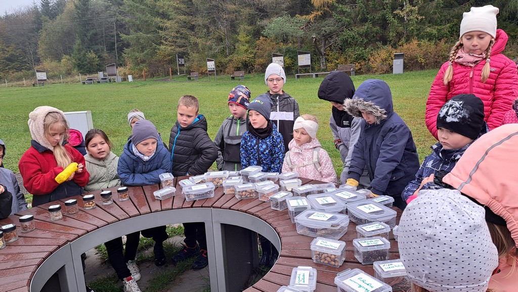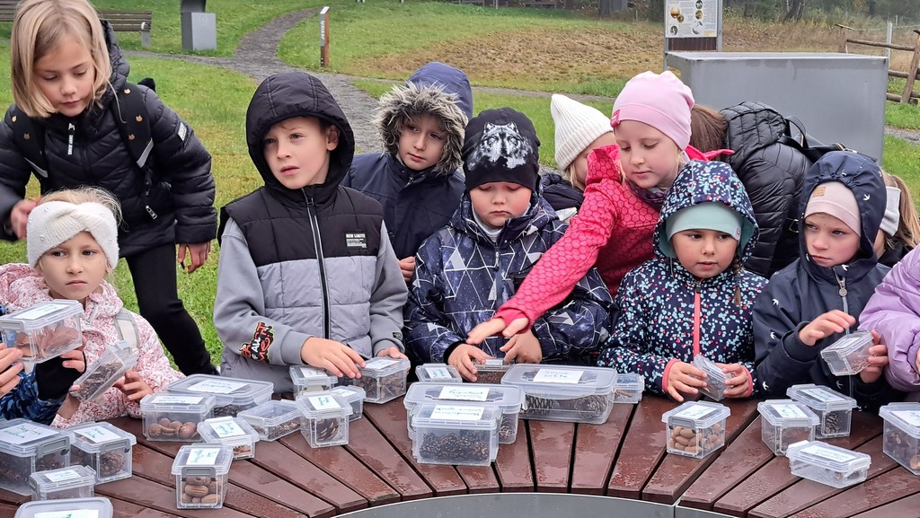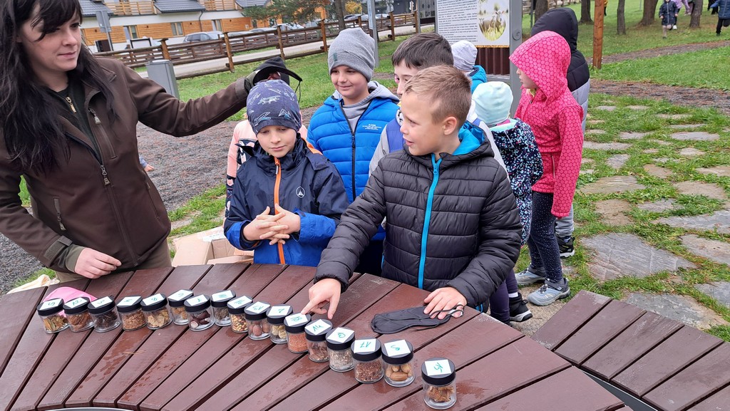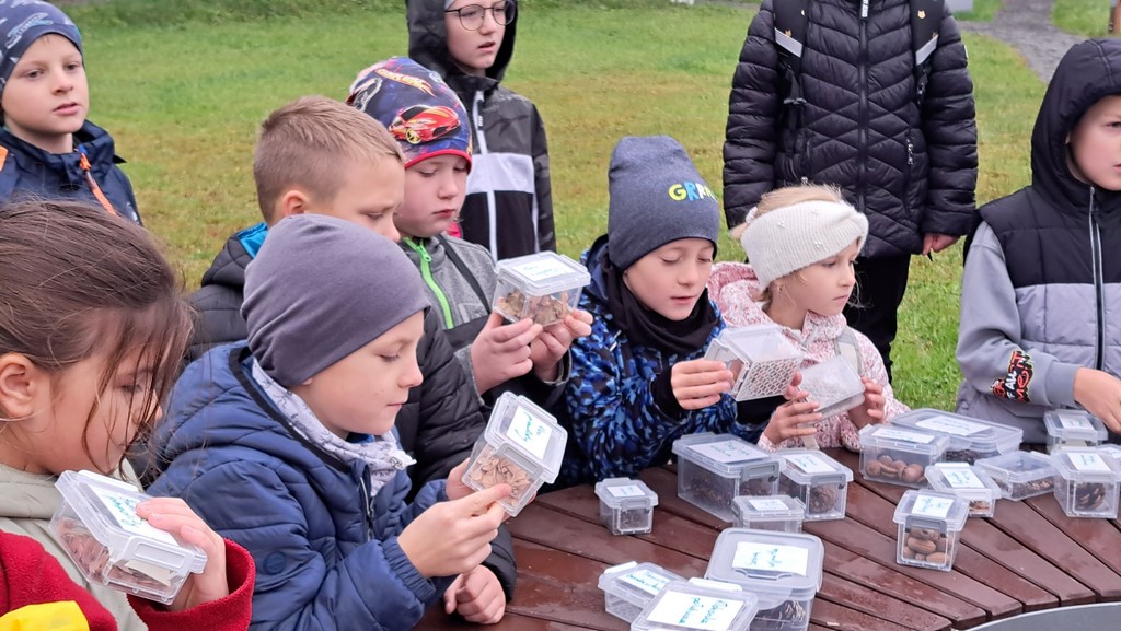 Po spacerze uczniowie mieli okazję obejrzeć nasiona poszczególnych drzew oraz wziąć udział w zabawie „Magiczny worek”.
