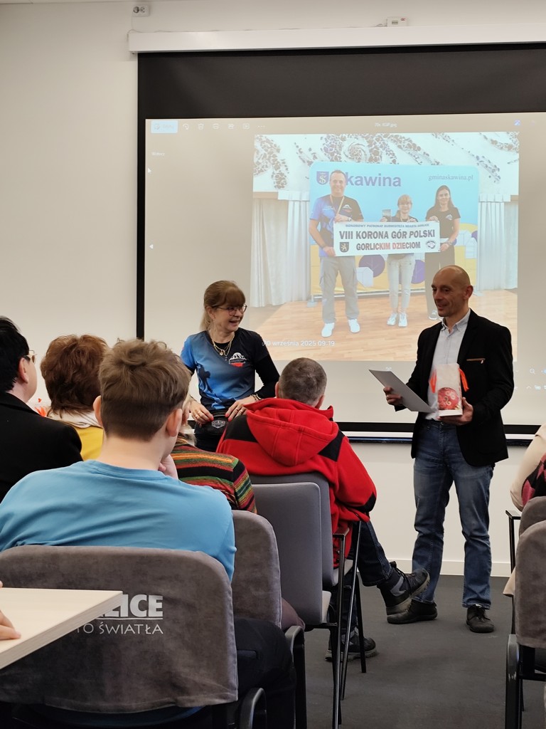 Dnia 03.12.2025 r. grupa uczniów naszej szkoły wraz z opiekunem brała udział w spotkaniu podsumowującym projekt ”VIII Korona Gór Polski- gorlickim dzieciom”, opracowany przez Panią Wiesławę Brudniak- siedmiokrotną zdobywczynię Korony Gór Polski. Prezentacje poszczególnych działań, slajdy ukazujące piękno gór i emocje dzieci zdobywających kolejne szczyty połączone ze wspomnieniami z wędrówek przywoływane przez autorkę programu, uświadomiły wszystkim nieocenioną wartość tego projektu. Cieszymy się, że i nasi uczniowie mogli wziąć w nim udział. Górska wędrówka z Chyszówek na Przełęczy Marszałka Rydza-Śmigłego i zdobycie Mogielicy-koronnego szczytu Beskidu Niskiego ,pomimo pięknej pogody okazało się nie lada wyzwaniem, ale też powodem do zadowolenia z pokonania własnych słabości i możliwości podziwiania ze szczytu wspaniałych górskich widoków. Naprawdę było warto .W tym kontekście wspólnie zaśpiewana piosenka zdobywców gór, podczas podsumowania projektowego była miłym ale i bardzo relaksacyjnym akcentem jednoczącym wszystkich „miłośników podróżowania”