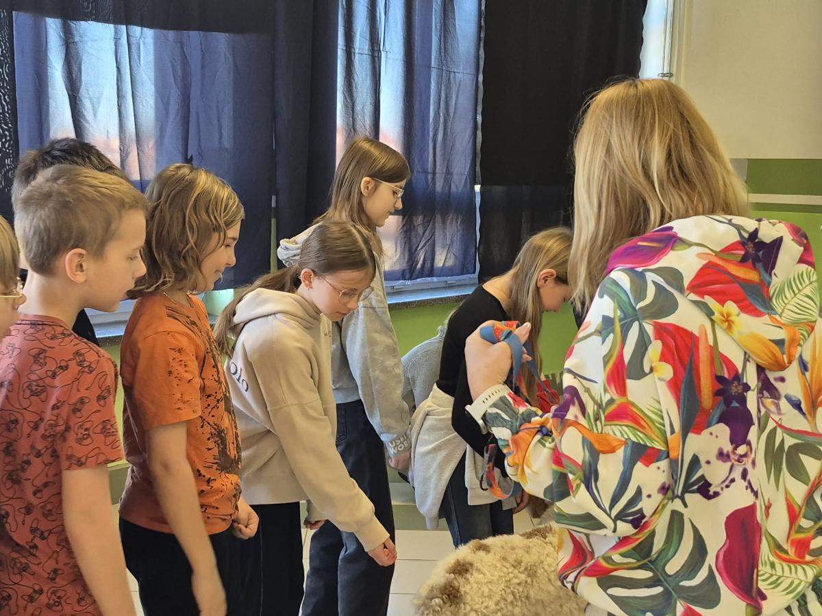 Dużą atrakcją spotkania była obecność psa Lokiego, który przyszedł razem z wolontariuszką. Dzieci mogły go pogłaskać i z bliska zobaczyć, jak wygląda kontakt z odpowiednio ułożonym i zadbanym pupilem. Spotkanie z Lokim sprawiło uczniom wiele radości i było dla nich cennym doświadczeniem.