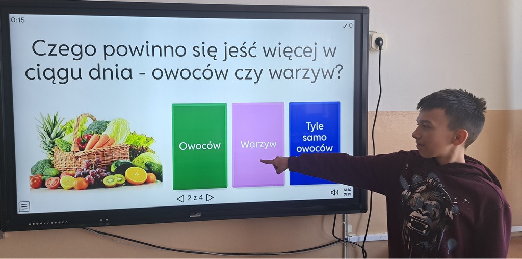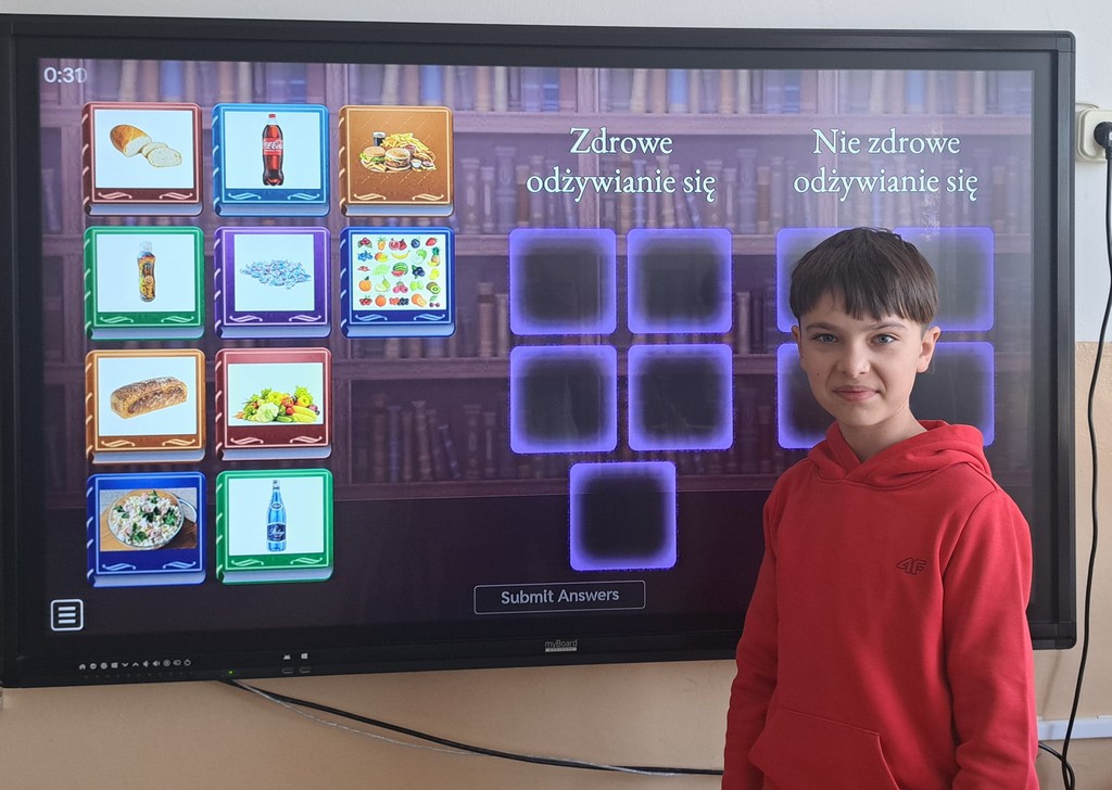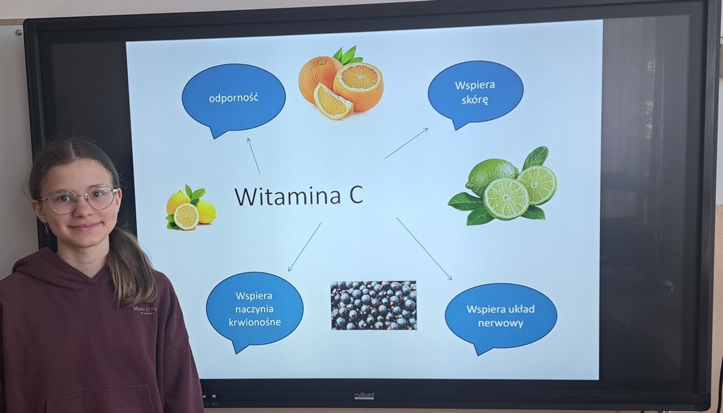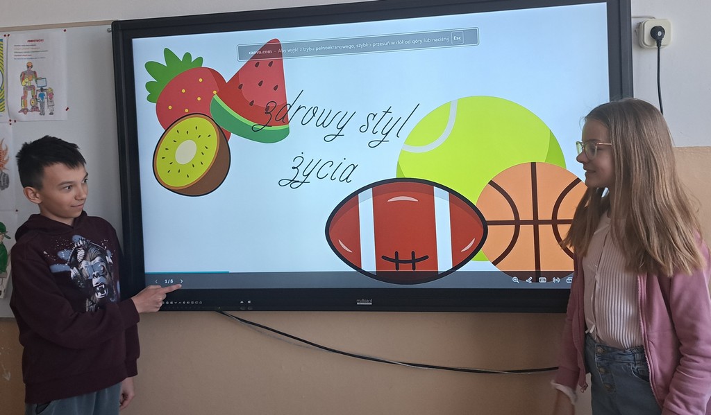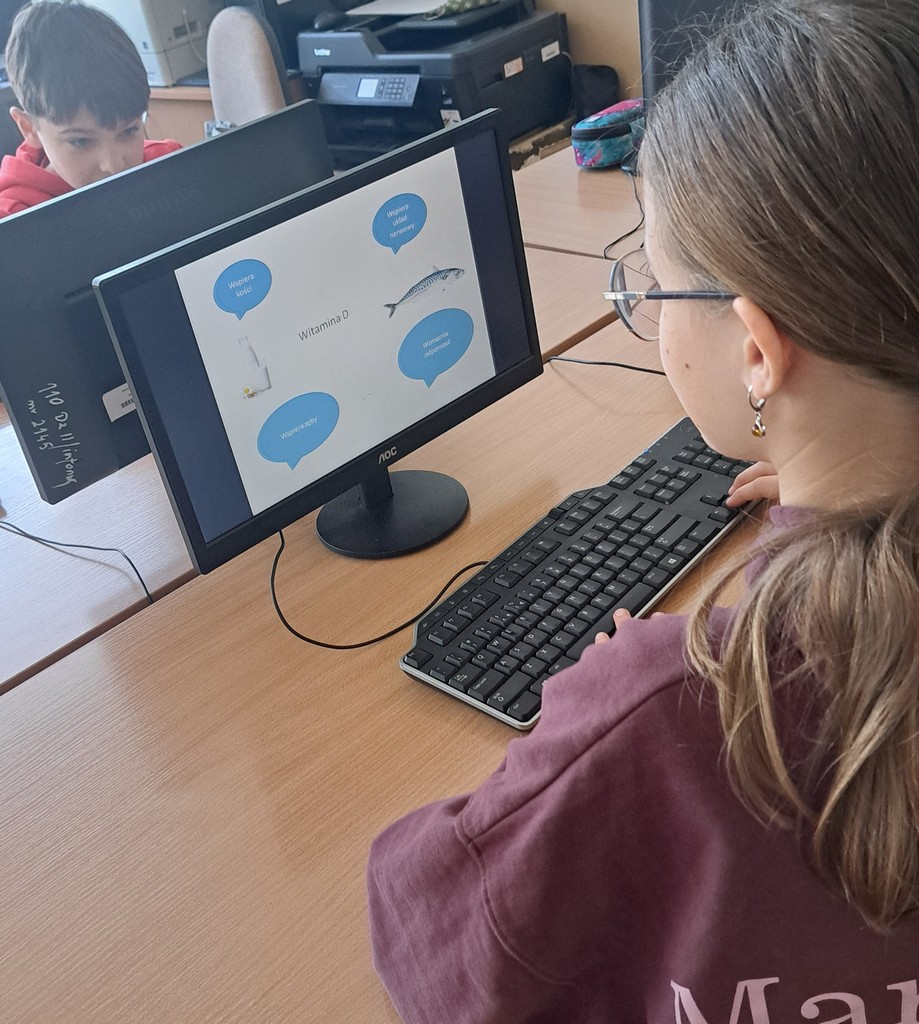 Ala zrobiła prezentację „Witaminy” w Programie PowerPoint. Antoś i Zosia wykorzystali w swojej pracy Canve i przygotowali prezentację „Zdrowy styl życia”. Natomiast Filip stworzył grę na Platformie Wordwall dotyczącą prawidłowego odżywiania się. Na koniec wszyscy rozwiązywali quizy i zagadki interaktywne na temat zdrowego odżywiania i aktywnego trybu życia. Poprzez prezentacje, zabawy dydaktyczne i rozmowy, uczniowie utrwalali istotne informacje na temat tego, jak dbać o zdrowie i utrzymywać dobre samopoczucie.